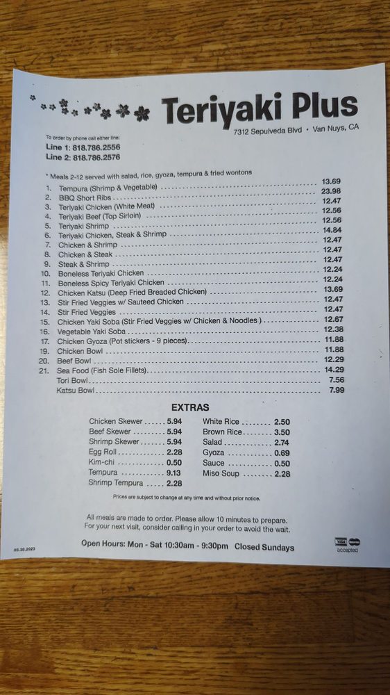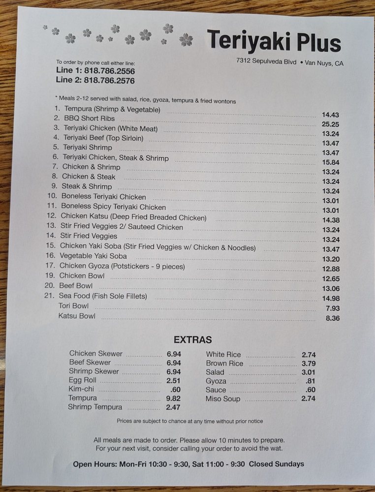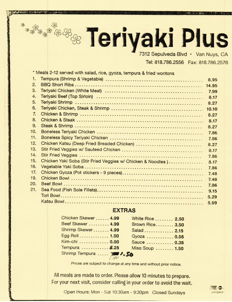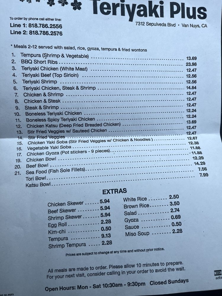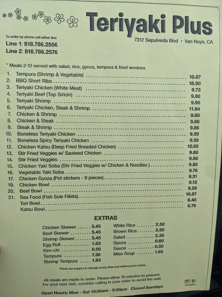 Introducing Teriyaki Plus, a delightful spot for Japanese cuisine located at 7312 Sepulveda Blvd, Van Nuys, CA. This casual eatery specializes in a variety of dishes, notably their chicken katsu and teriyaki plates, both well-loved by diners. The menu encourages exploration, with enticing options like beef skewers and BBQ short ribs, ensuring there's something for everyone.